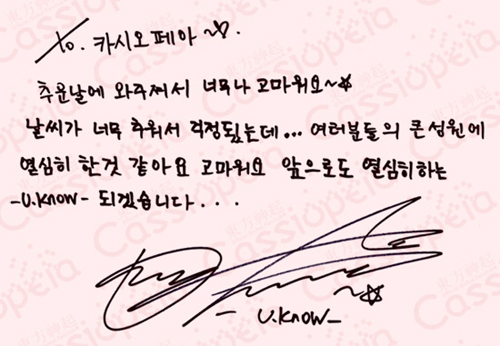 ここには「寒い日に来てくれて本当にありがとう。とても寒くて心配だったけど…皆さんの大きな声援で頑張れた気がします。ありがとう。これからも一生懸命やる-U.KNOW-でいたいと思います…」と書かれている。