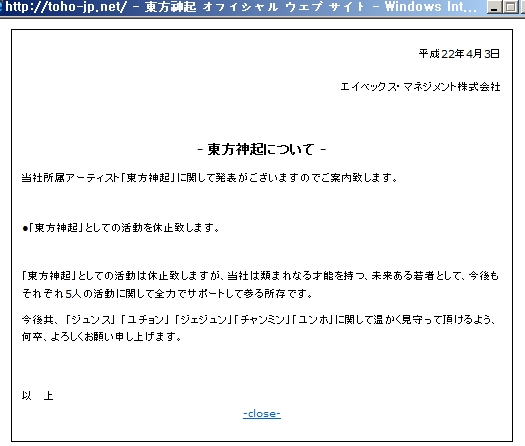 だが日本でも12月31日NHK ‘ホンベッカハプチョン’以後シングル,ベストアルバムなどの踊るところは他には五人が公式席上に出て活動したことはない。 これに今回のエイベックスの発表で東方新起は公式に五人電源の活動が中断された。
