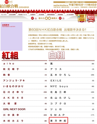 NHKは23日'紅白歌合戦'ホームページを通じて12月31日生放送に出演する歌手らを公式発表した。 ホンチームと百チームに分かれて日本トップの歌手60チームがリストに名前を上げた。 東方新起は百チームに名前を上げて日本最高アイドル スマプ(SMAP),アラシ(嵐)等と一チームを組むことになった。