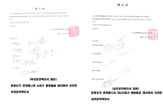 東方新起の中国,深川(シムチョン)公演公演確認書署名が偽造されたという主張が提起された。