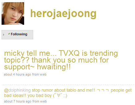 ジェジュンは今回、「ミッキー(ユチョン)、トレンディング・トピック(Twitterで提供する人気検索語)で助けてくれてありがとう。ファイト!」と短い英文でメッセージを残した。