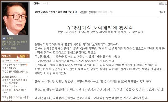 贈賄容疑で逮捕・起訴された朴淵次(パク・ヨンチャ)泰光実業前会長の弁護人として知られるパク・チャンジョン弁護士が、東方神起と所属事務所SMエンターテインメント(以下、SM)の契約騒動について、「東方神起がSMと交わした契約は明らかに“奴隷契約”」と語った。