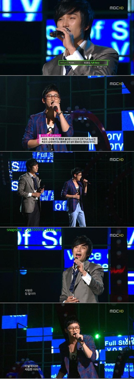 V.O.S(チェ・ヒョンジュン、キム・ギョンロク)は18日放送されたMBC 'ショー! 音楽中心'(以下陰中、MCスーパージュニア ウニョク、f(x)(エフ エックス)クリスタル、アフタースクール リッジ)で'Full Story'(草ストーリー)をリリースした。