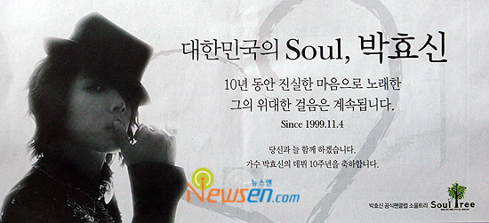 パク・ヒョシンの写真と共に掲載された今回の広告でファンたちは"大韓民国のSoul,パク・ヒョシン" "10年の間真実の気持ちで歌った彼の偉大な歩みは続きますS ince 1999.11.4"として"あなたといつも一緒にします。 歌手パク・ヒョシンのデビュー10周年をおめでとうございます"と彼を応援した。